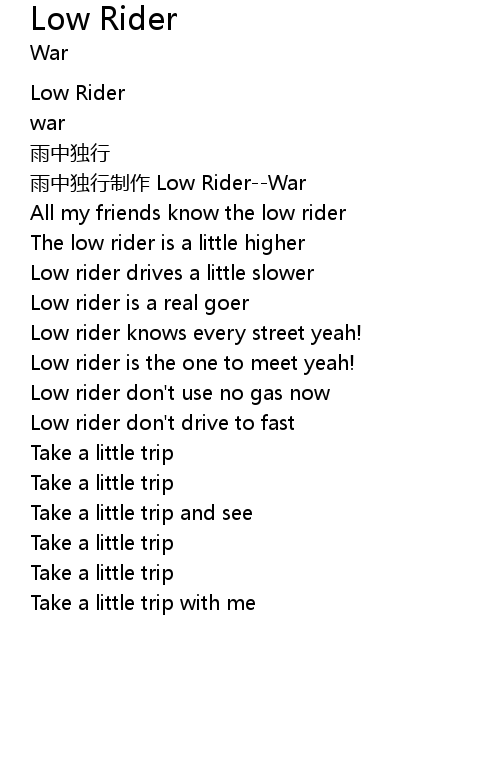 | [00:01.58] | yǔ zhōng dú xíng zhì zuò Low RiderWar |