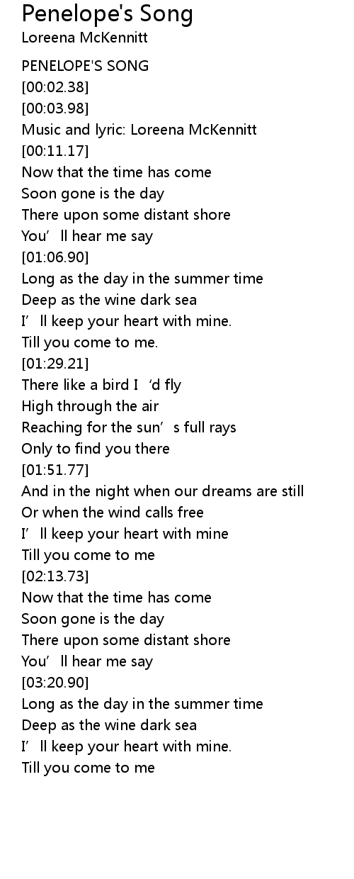 | [00:06.23] | Music and lyric: Loreena McKennitt |