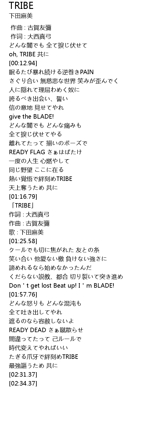 | [02:19.67] | たぎる爪牙で絆刻めTRIBE |