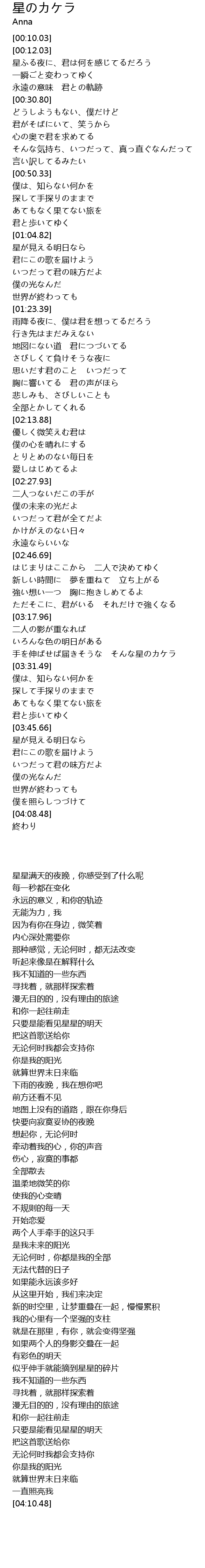 | [00:14.03] | 星ふる夜に、君は何を感じてるだろう |
