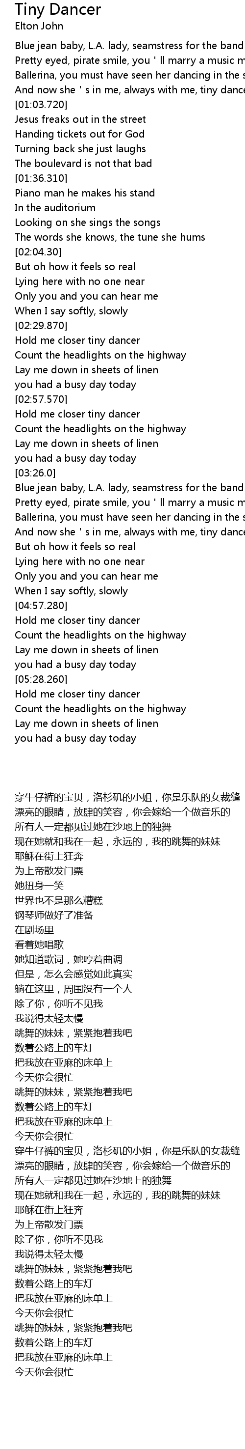 | [00:52.880] | And now she s in me, always with me, tiny dancer in my hand |
