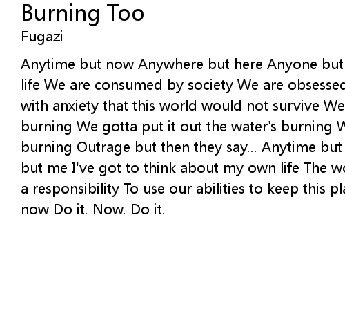 Anytime but now Anywhere but here Anyone but me I've got to think about my own life We are consumed by society We are obsessed with variety We are all filled with anxiety that this world would not survive We gotta put it out the sky is burning We gotta put it out the water's burning We gotta put it out the earth is burning Outrage but then they say... Anytime but now Anywhere but here Anyone but me I've got to think about my own life The world is not our facility We have a responsibility To use our abilities to keep this place alive Right here right now Do it. Now. Do it. |