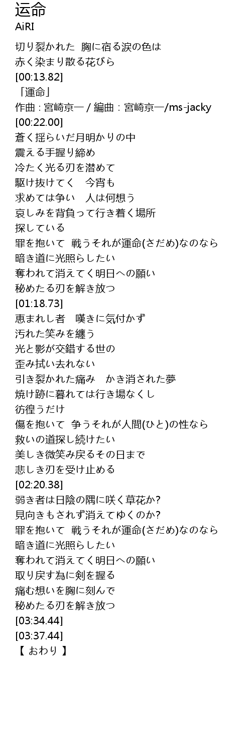 | [00:56.77] | 罪を抱いて 戦うそれが運命(さだめ)なのなら |