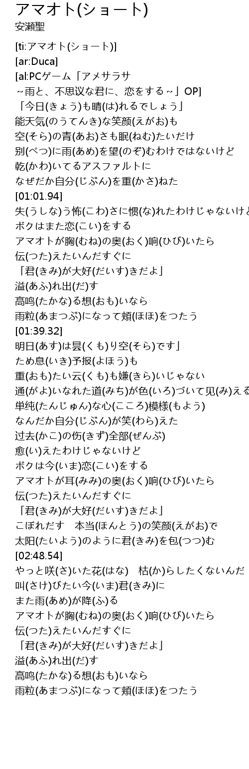 | [01:15.21] | アマオトが胸(むね)の奥(おく)响(ひび)いたら |