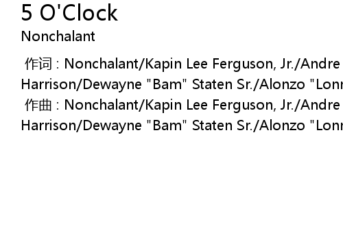 | [00:00.000] | zuo qu : Nonchalant Kapin Lee Ferguson, Jr. Andre " Smoovy" Harrison Dewayne " Bam" Staten Sr. Alonzo " Lonnie" Simmons Jr. Raguel " Bink" Dill |