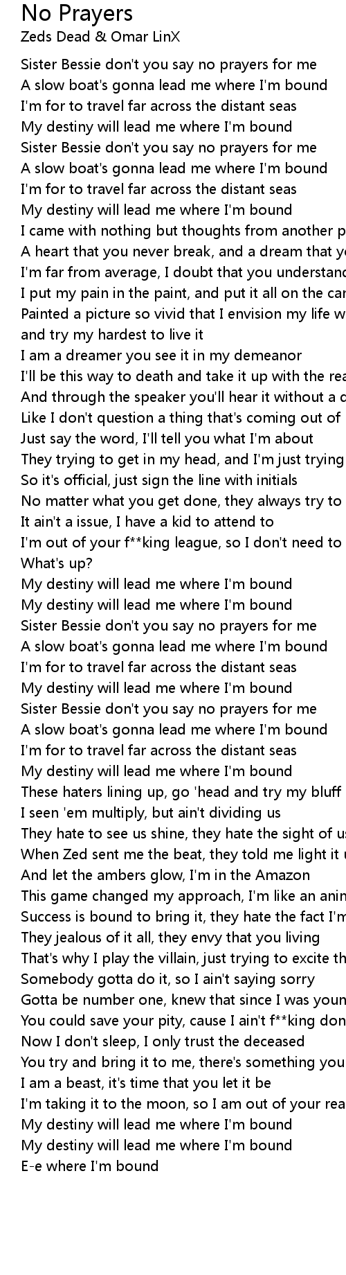 Sister Bessie don't you say no prayers for me |