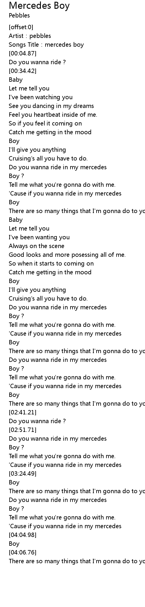 | [02:22.77] | Do you wanna ride in my mercedes |