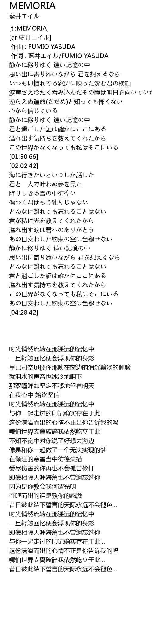 | [03:32.34] | 静かに移りゆく 遠い記憶の中 |