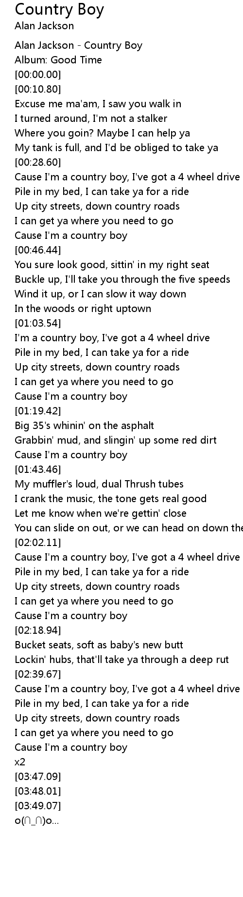 | [01:03.71] | I' m a country boy, I' ve got a 4 wheel drive |
