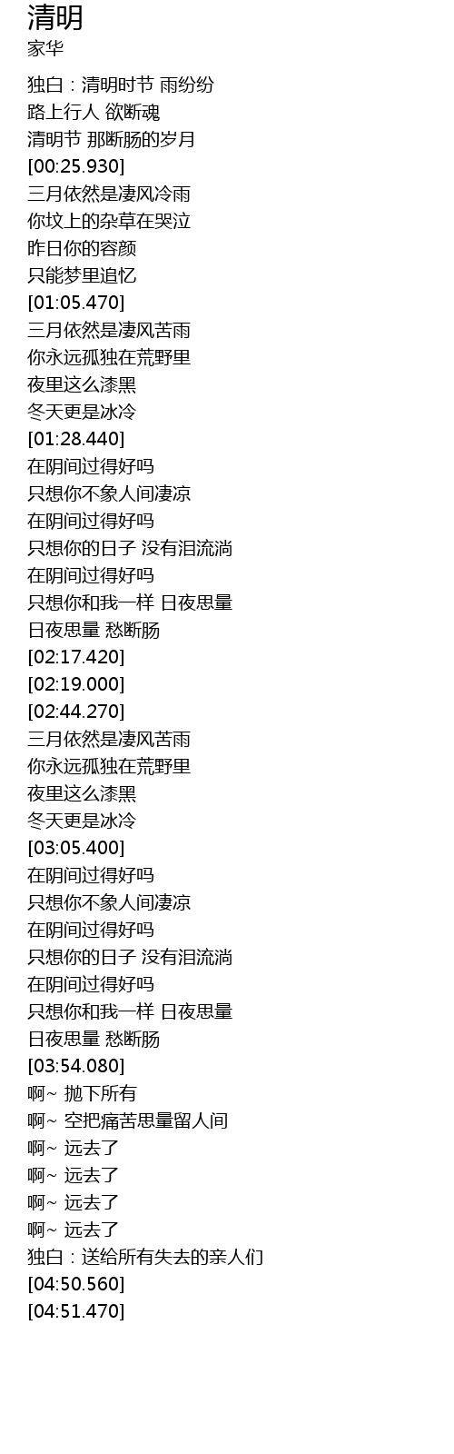 | [04:47.870] | 独白:送给所有失去的亲人们 |