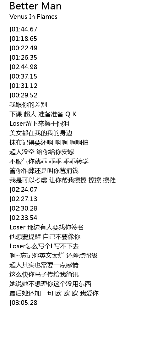 | [00:20.11][00:22.49][00:21.06][00:32.92][00:34.36][00:36.05] | year~我是superman |