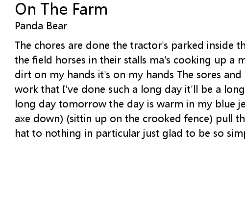 The chores are done the tractor's parked inside the barn the cows are grazing in the field horses in their stalls ma's cooking up a meal that reeks(?) from the dirt on my hands it's on my hands The sores and bumps on my body speak of the work that I've done such a long day it'll be a long tomorrow (is in our eyes) long day tomorrow the day is warm in my blue jeans (bring the axe down bring the axe down) (sittin up on the crooked fence) pull the hoe across the yard tip my hat to nothing in particular just glad to be so simple |