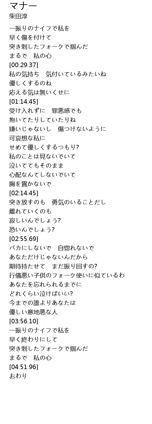 | [00:46.29] | 私の気持ち 気付いているみたいね |
