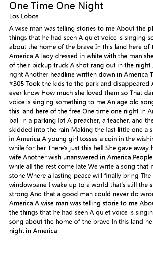 A wise man was telling stories to me About the places he had been to And the things that he had seen A quiet voice is singing something to me An age old song about the home of the brave In this land here of the free One time one night in America A lady dressed in white with the man she loved Standing along the side of their pickup truck A shot rang out in the night Just when everything seemed right Another headline written down in America The guy that lived next door in #305 Took the kids to the park and disappeared About half past nine Who will ever know How much she loved them so That dark night alone in America A quiet voice is singing something to me An age old song about the home of the brave In this land here of the free One time one night in America Four small boys playing ball in a parking lot A preacher, a teacher, and the other became a cop A car skidded into the rain Making the last little one a saint One more light goes out in America A young girl tosses a coin in the wishing well She hopes for a heaven while for her There's just this hell She gave away her life To become somebody's wife Another wish unanswered in America People having so much faith Die too soon while all the rest come late We write a song that no one sings On a cold black stone Where a lasting peace will finally bring The sunlight plays upon my windowpane I wake up to a world that's still the same My father said to be strong And that a good man could never do wrong In a dream I had last night in America A wise man was telling storie to me About the places he had been to And the things that he had seen A quiet voice is singing something to me An age old song about the home of the brave In this land here of the free One time one night in America |
