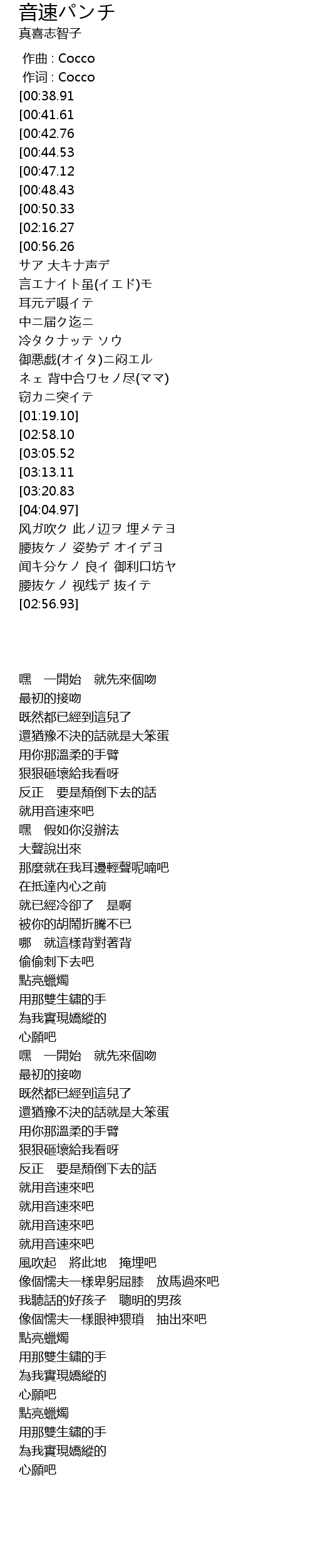 | [01:55.04][00:38.91] | サア 始マリノ接吻ヲシテ |