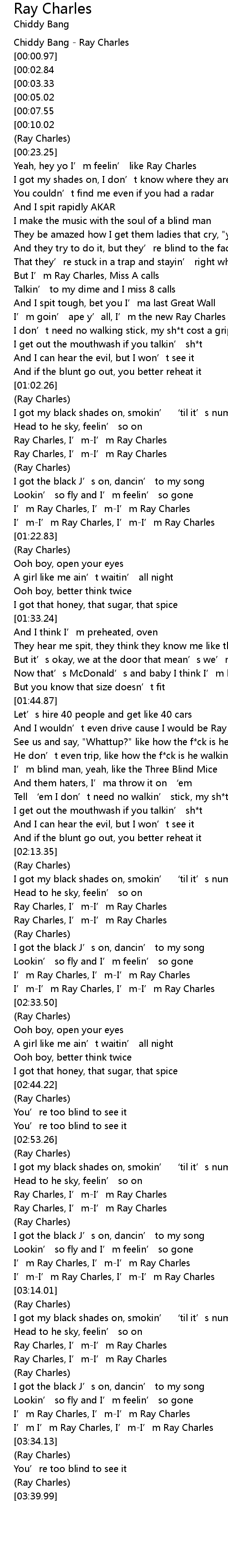 | [00:23.72] | Yeah, hey yo I' m feelin' like Ray Charles |