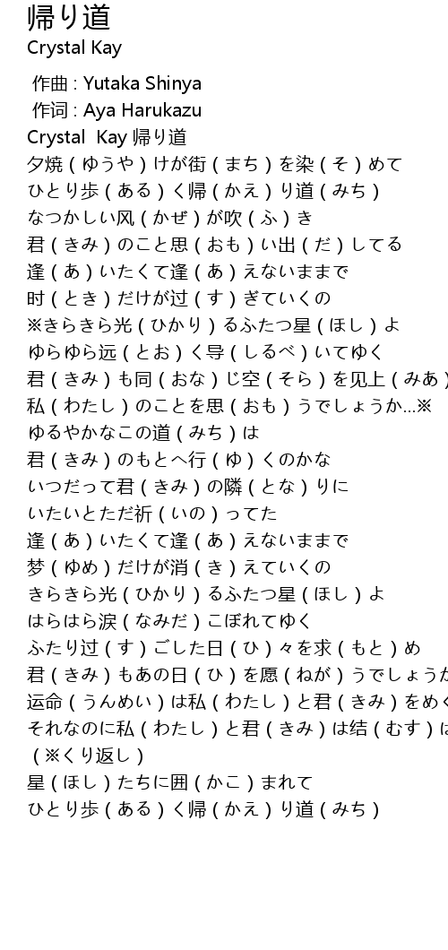 | [03:38.222] | ひとり歩(ある)く帰(かえ)り道(みち) |