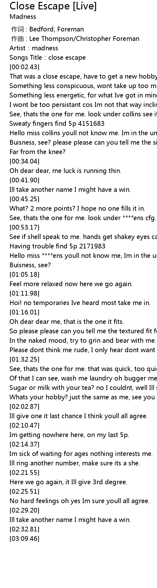 | [00:01.13] | Songs Title:close escape |
