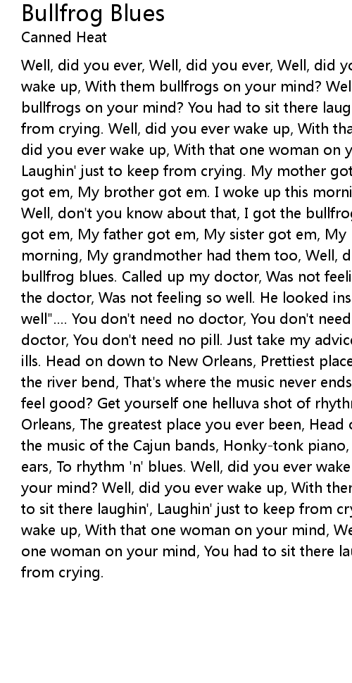 Well, did you ever, Well, did you ever, Well, did you ever, Well, did you ever wake up, With them bullfrogs on your mind? Well, did you ever wake up, With them bullfrogs on your mind? You had to sit there laughin', Laughin' just to keep from crying. Well, did you ever wake up, With that one woman on your mind, Well, did you ever wake up, With that one woman on your mind, Sit there laughin', Laughin' just to keep from crying. My mother got em, My father got em, My sister got em, My brother got em. I woke up this morning, My grandmother had them too, Well, don't you know about that, I got the bullfrog blues. Bullfrog My mother got em, My father got em, My sister got em, My brother got em. I woke up this morning, My grandmother had them too, Well, don't you know about that, I got the bullfrog blues. Called up my doctor, Was not feeling so well, Well, I called up the doctor, Was not feeling so well. He looked inside his bag and said, "Well, well".... You don't need no doctor, You don't need no pill, You don't need no doctor, You don't need no pill. Just take my advice, It'll surely cure your ills. Head on down to New Orleans, Prettiest place you ever seen, Get on down to the river bend, That's where the music never ends. Open your ears, Don't you feel good? Get yourself one helluva shot of rhythm 'n' blues. Go on down to new Orleans, The greatest place you ever been, Head on down to the river bend, Dig the music of the Cajun bands, Honky-tonk piano, Make you feel good, Open your ears, To rhythm 'n' blues. Well, did you ever wake up, With them bullfrogs on your mind? Well, did you ever wake up, With them bullfrogs on your mind? You had to sit there laughin', Laughin' just to keep from crying. Well, did you ever wake up, With that one woman on your mind, Well, did you ever wake up, With that one woman on your mind, You had to sit there laughing, Laughing just to keep from crying. |