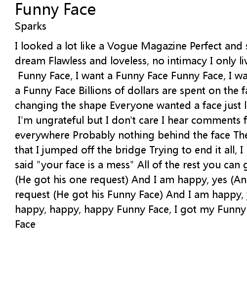 I looked a lot like a Vogue Magazine Perfect and smooth, they all called me a dream Flawless and loveless, no intimacy I only lived to be seen Not to be touched, too clean [Chorus:] Funny Face, I want a Funny Face Funny Face, I want a Funny Face Billions of dollars are spent on the face Covering, smoothing, and changing the shape Everyone wanted a face just like mine Nobody wanted me Only to look like me [Chorus] I'm ungrateful but I don't care I hear comments from everywhere Probably nothing behind the face The face, the face That was the day that I jumped off the bridge Trying to end it all, I barely lived Doctor Lamaar said "your face is a mess" All of the rest you can guess I got my one request (He got his one request) And I am happy, yes (And he is happy, yes) I got my one request (He got his Funny Face) And I am happy, yes And I am happy, happy, happy, happy, happy Funny Face, I got my Funny Face Funny Face, I got my Funny Face |