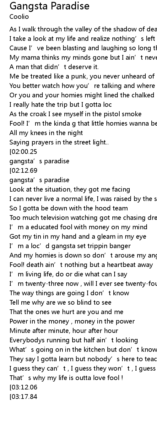 | [02:48.70][02:00.25][00:48.95] | Been spending most of our lives living in the gangsta’s paradise |