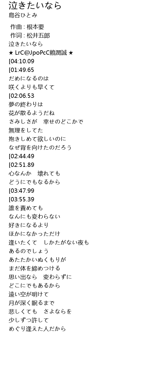 | [01:03.21][02:44.49][03:21.83] | 泣きたいなら かまわずに |