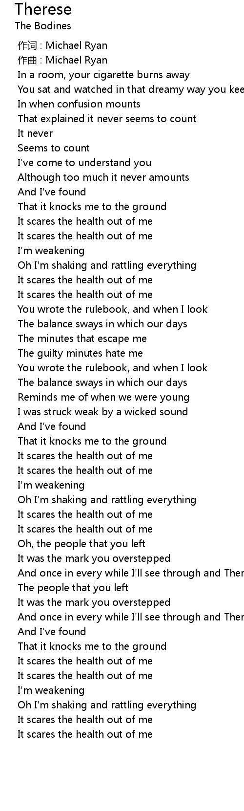 | [02:15.068] | And once in every while I' ll see through and Therese, she' ll smile |
