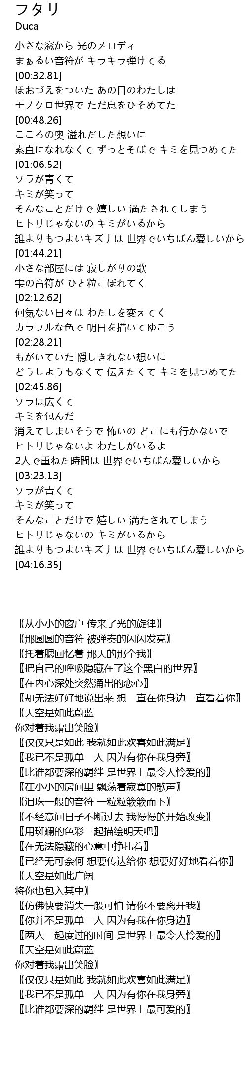| [04:03.49] | 〖比谁都要深的羁绊 是世界上最可爱的〗 |