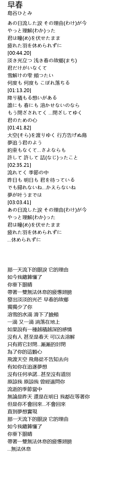 | [00:44.58] | 淡き光立つ 浅き春の故郷(まち) |