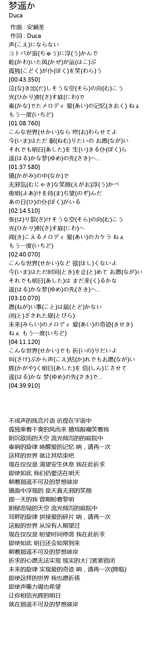 | [04:31.010] | 遥(はる)かな 梦(ゆめ)の先(さき)で… |