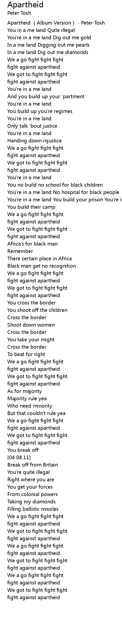 | [00:02.72] | Apartheid Album Version Peter Tosh |