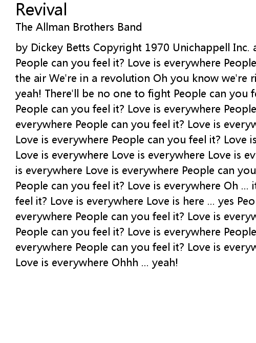 by Dickey Betts Copyright 1970 Unichappell Inc. and F. R. Betts Music (BMI) People can you feel it? Love is everywhere People can you hear it? A song is in the air We're in a revolution Oh you know we're right Everyone is singing ... yeah! There'll be no one to fight People can you feel it? Love is everywhere People can you feel it? Love is everywhere People can you feel it? Love is everywhere People can you feel it? Love is everywhere People can you feel it? Love is everywhere People can you feel it? Love is everywhere Love is everywhere Love is everywhere Love is everywhere Love is everywhere Love is everywhere Love is everywhere Love is everywhere People can you feel it? Love is everywhere People can you feel it? Love is everywhere Oh ... it's everywhere People can you feel it? Love is everywhere Love is here ... yes People can you feel it? Love is everywhere People can you feel it? Love is everywhere Ohhhh ... it's everywhere People can you feel it? Love is everywhere People can you feel it? Love is everywhere People can you feel it? Love is everywhere People can you feel it? Love is everywhere Ohhh ... yeah! |