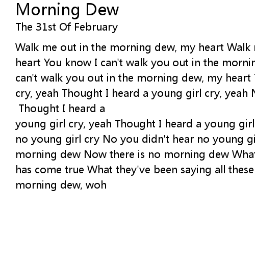 Walk me out in the morning dew, my heart Walk me out in the morning dew, my heart You know I can't walk you out in the morning dew, my heart You know I can't walk you out in the morning dew, my heart Thought I heard a young girl cry, yeah Thought I heard a young girl cry, yeah No you didn't hear no young girl cry at all No you didn't hear no young girl cry [solo] Thought I heard a young girl cry, yeah Thought I heard a young girl cry, yeah No you didn't hear no young girl cry No you didn't hear no young girl cry at all Now there is no morning dew Now there is no morning dew What they've been saying all these years has come true What they've been saying all these years has come true Got no morning dew, woh |