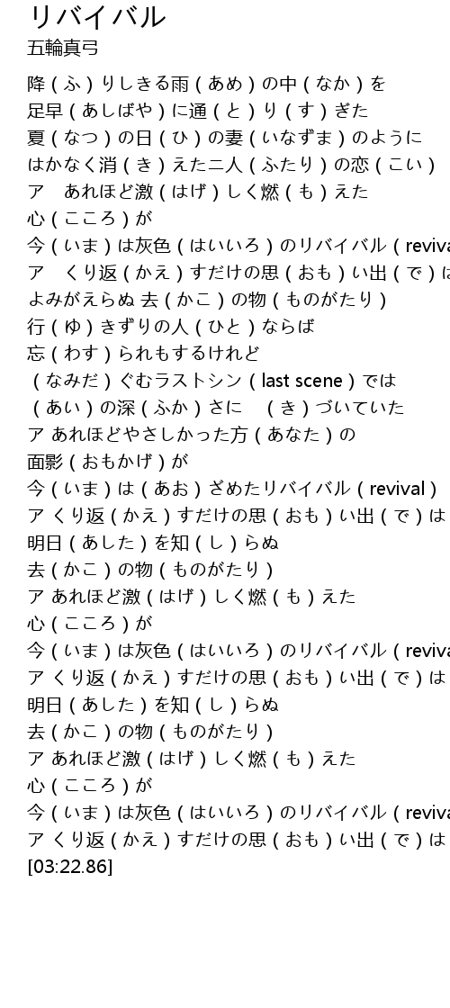 | [02:01.55] | 面影(おもかげ)が 今(いま)は(あお)ざめたリバイバル(revival) |