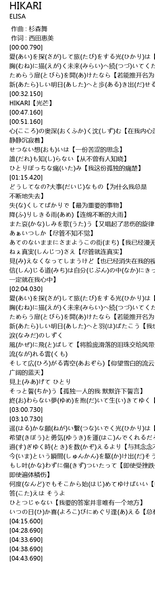 | [00:01.790] | 愛(あい)を探(さが)して旅(たび)をする光(ひかり)は【为寻爱而踏上旅途的那缕光芒】 |