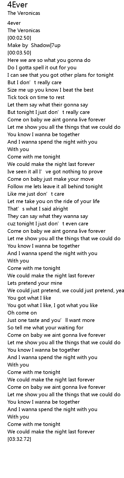 | [02:58.00] | Come on baby we aint gonna live forever |