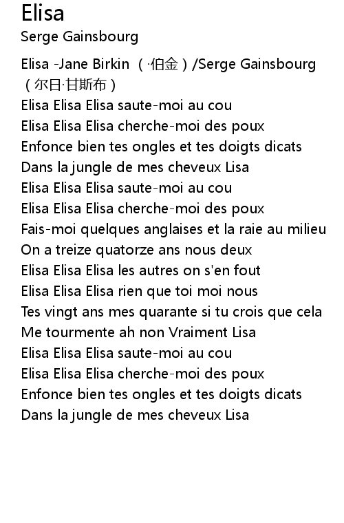 | [00:00.00] | Elisa -Jane Birkin (·伯金)/Serge Gainsbourg (尔日·甘斯布) |