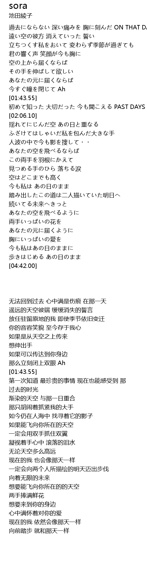| [01:53.07] | 初めて知った 大切だった 今も聞こえる PAST DAYS |
