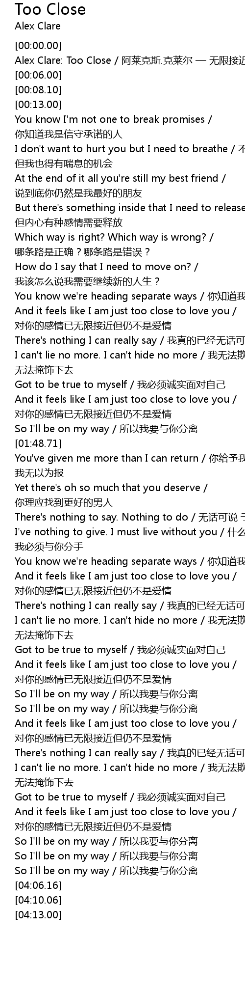 | [00:01.00] | Alex Clare: Too Close a lai ke si. ke lai er wu xian jie jin |