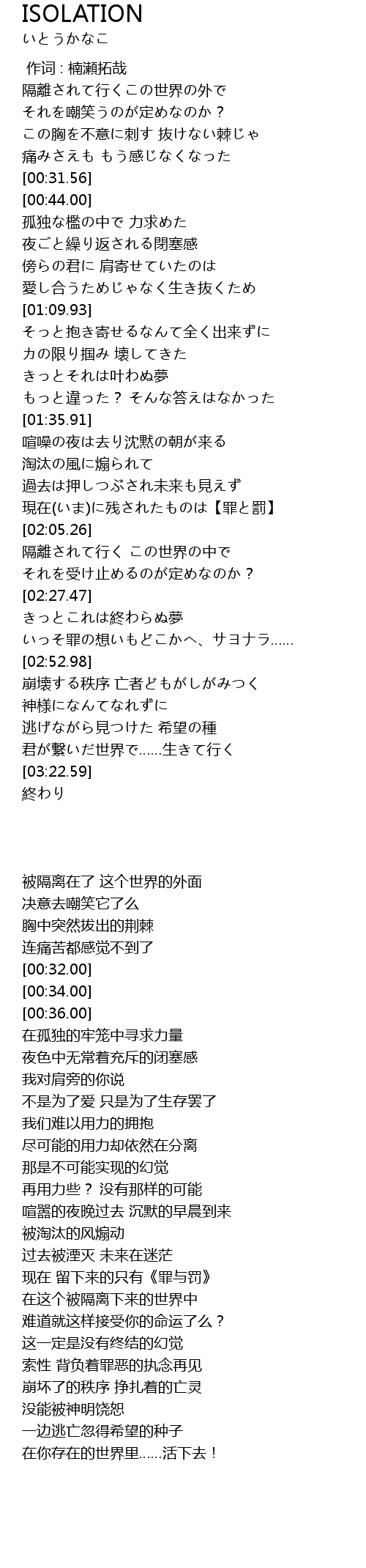 | [02:14.41] | 隔離されて行く この世界の中で |