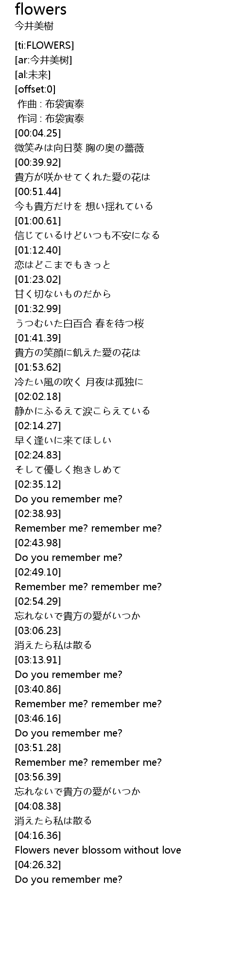 | [00:32.18] | 微笑みは向日葵 胸の奥の薔薇 |