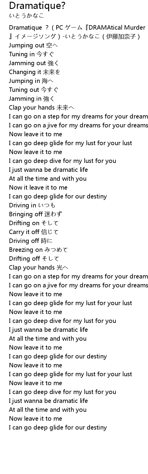 | [00:00.429] | Dramatique ?(PC ゲーム『DRAMAtical Murder 』イメージソング)-いとうかなこ(伊藤加奈子) |