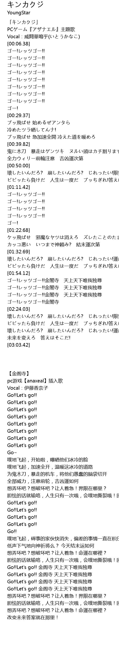 | [02:21.35] | Go!!Let's go!! 金阁寺 天上天下唯我独尊 |