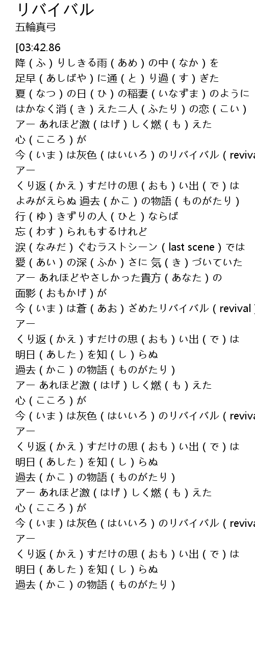 | [03:06.79] | 心(こころ)が 今(いま)は灰色(はいいろ)のリバイバル(revival) |