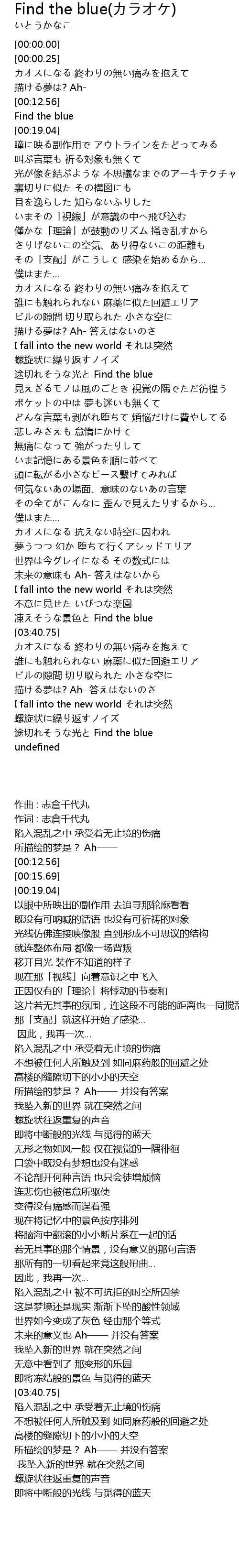 | [03:29.00] | 凍えそうな景色と Find the blue |