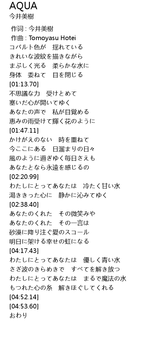 | [04:18.78] | わたしにとってあなたは 優しく青い水 |