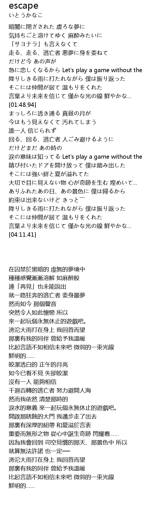 | [02:22.50] | lèi yì wèi zhī Let' s play a game without the end. |