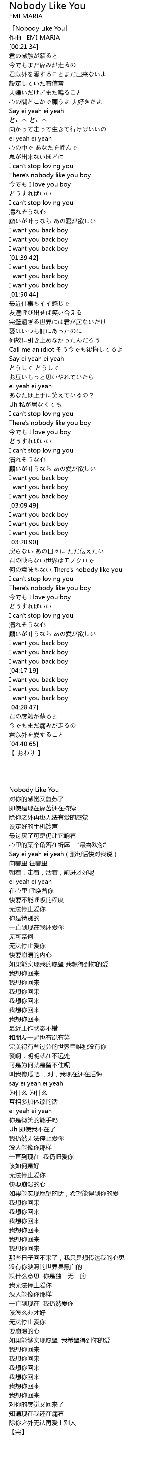 | [00:01.34] | 「Nobody Like You」 |