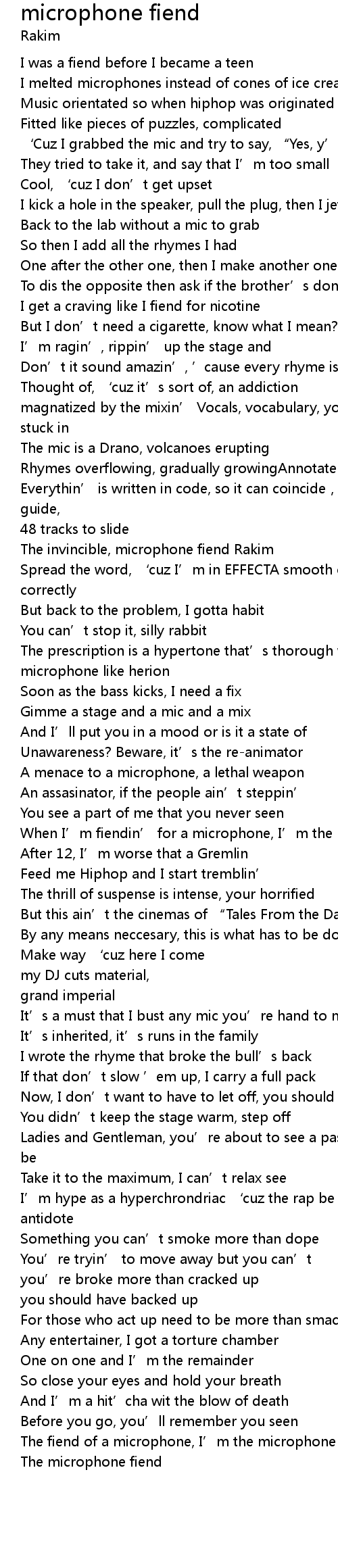 | [01:57.25] | When I’m fiendin’ for a microphone, I’m the microphone fiend |