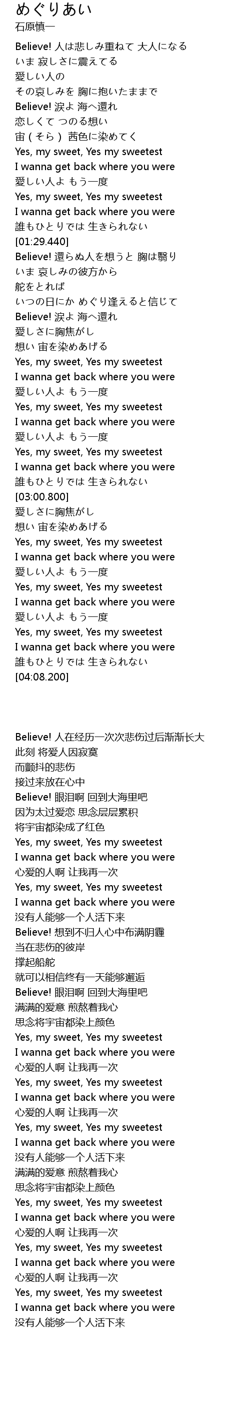 | [00:40.740] | Believe! 眼泪啊 回到大海里吧 |